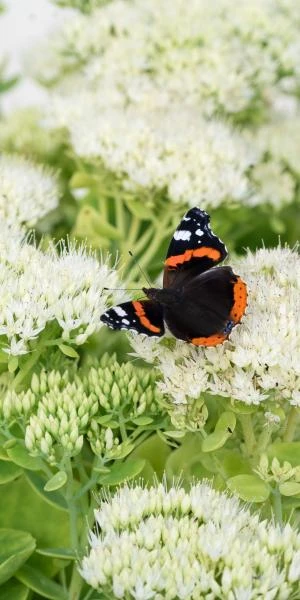 Dense clusters of tiny white flowers like starbursts, open from greenish-white buds above fleshy grey-green stems with rounded foliage. Like most Hylotelephium this plant starts to perform in spring, when its pale buds emerge from the ground, slowly developing into clumps of distinctive foliage. In late summer the white flowers appear, becoming more fluffy as the season moves into autumn. Seedheads stay upright through winter, looking attractive, especially when edged with frost.
