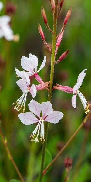 Tall, elegant and upright Oenothera ‘Rose Fan’ owes much in form and habit to one of its parents Oenothera sinuosa but boasts the palest pink starry flowers, each picked out with dark pink veining, influenced by its other parent Oenothera  lindheimeri ‘Chiffon’ .Â