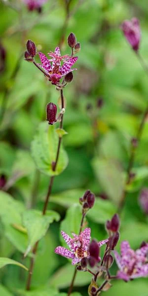 Toad Lily is an intriguing plant for shady or partially shady borders with moisture retentive but free-draining, humus-rich soil. In very cold areas of the UK a layer of mulch will help protect the rootstock over winter and increase the chances of flowering prior to the first winter frosts.
